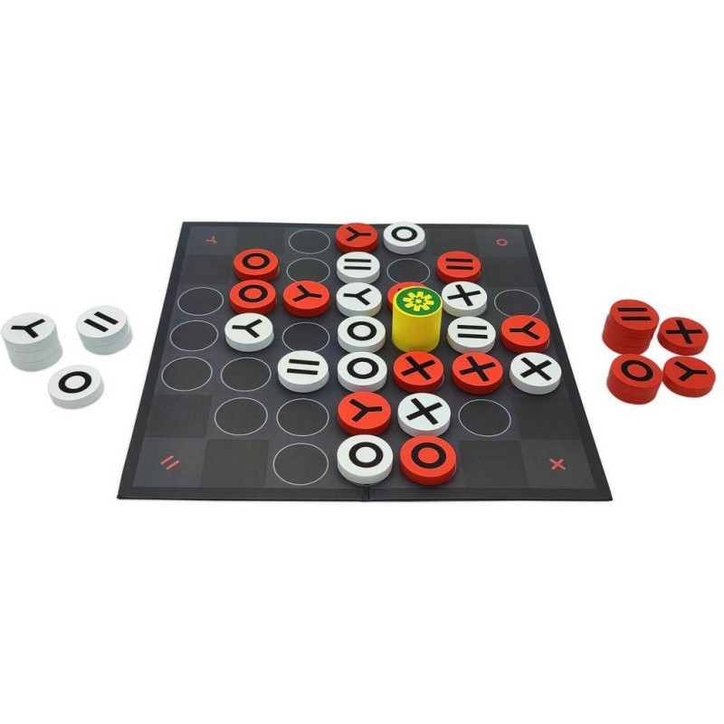 Contenu : 1 boite aimantée, 18 pièces en bois blanches, 18 pièces en bois rouges, 1 Totem en bois, 1 plateau de jeu, 1 livret de règles.
