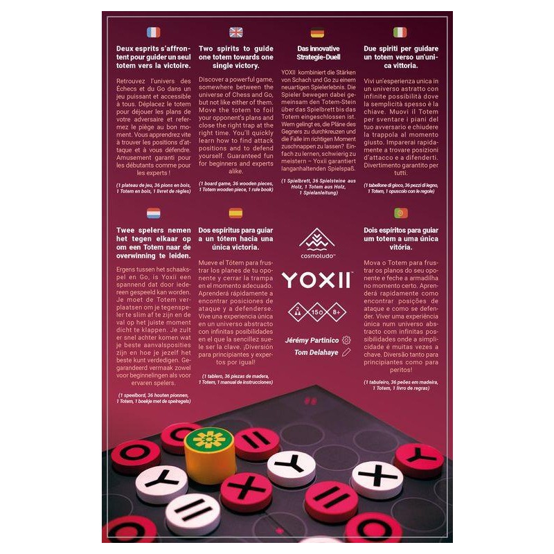Dans ce jeu de déplacement et de placement, les joueurs peuvent sauter leurs propres pièces et aller se placer là où le terrain leur est favorable. L’anticipation est la clé et vous permettra d'adapter votre stratégie rapidement. Notez que l'ouverture du jeu est très stratégique et les fins de parties sont plus combinatoires. Le Yoxii est donc une forme de synthèse entre les Échecs et le Go, facile à apprendre et à comprendre.
