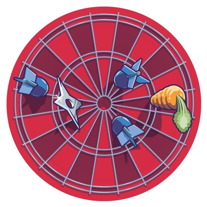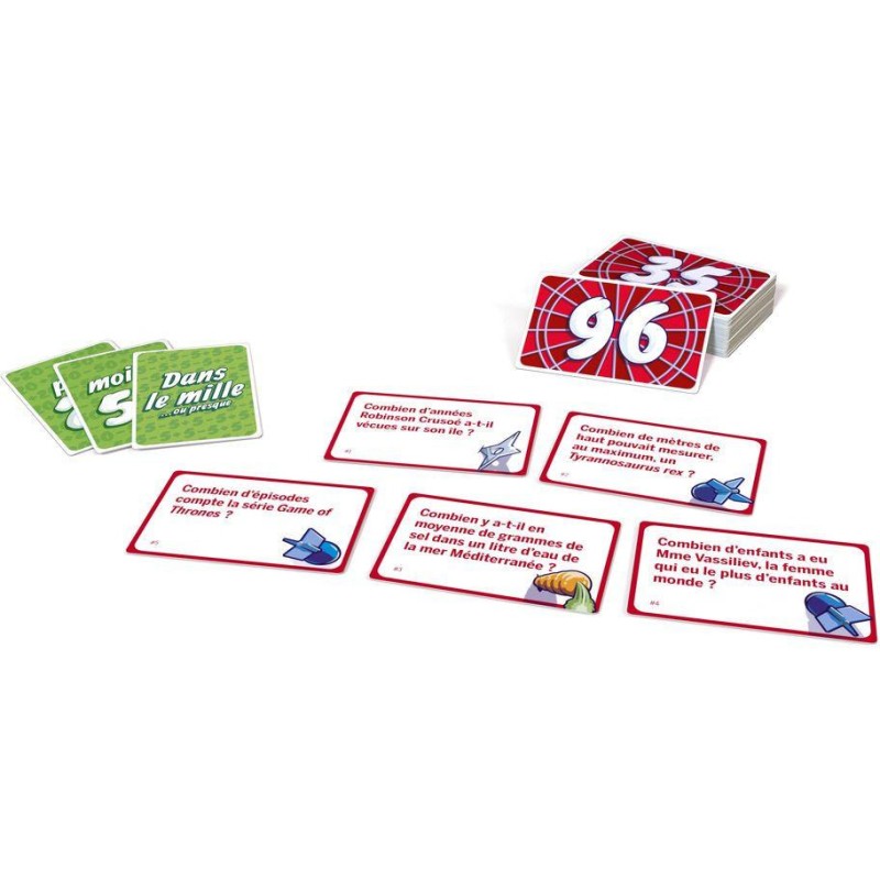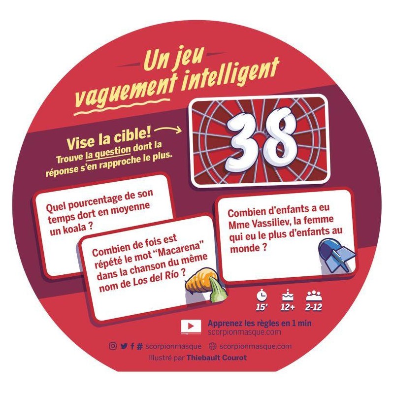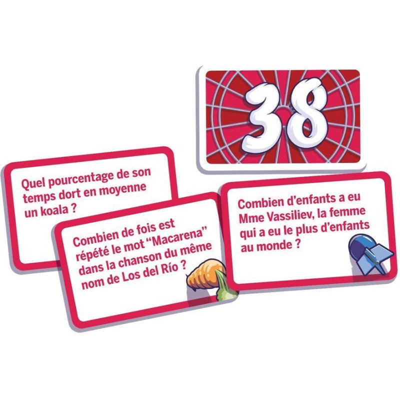 Un jeu vaguement intelligent ! Discutez avec votre équipe pour trouver laquelle de vos cartes Question comporte la réponse la plus proche de la cible. L’équipe la plus éloignée de la cible doit reprendre une carte. La première équipe à qui il ne reste qu’une seule carte l’emporte !