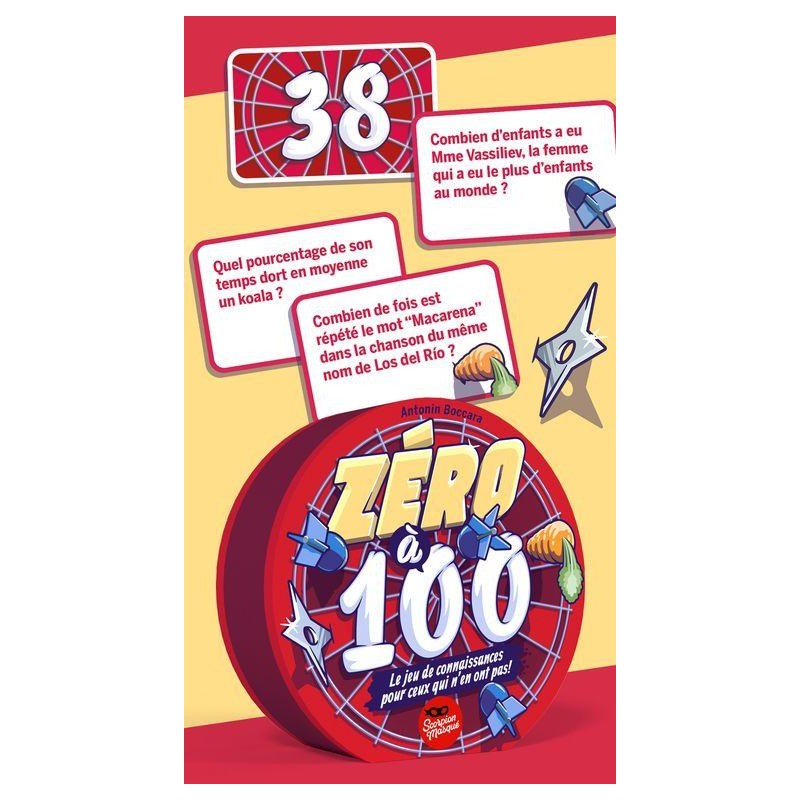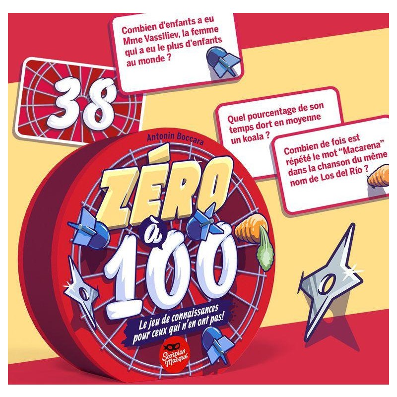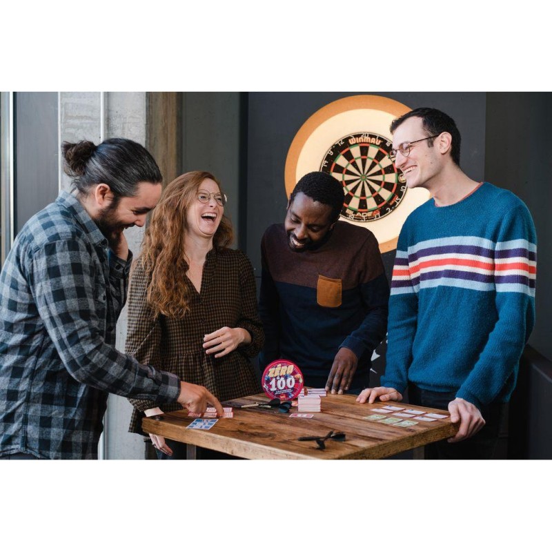 S’amuser en apprenant. Zéro à 100 est un jeu vaguement intelligent ! Discutez avec votre équipe et faites consensus pour désigner laquelle de vos cartes Question comporte la réponse la plus susceptible de se rapprocher de la cible. L’équipe la plus devra reprendre une carte. La première équipe à qui il ne reste qu’une l’emportera.